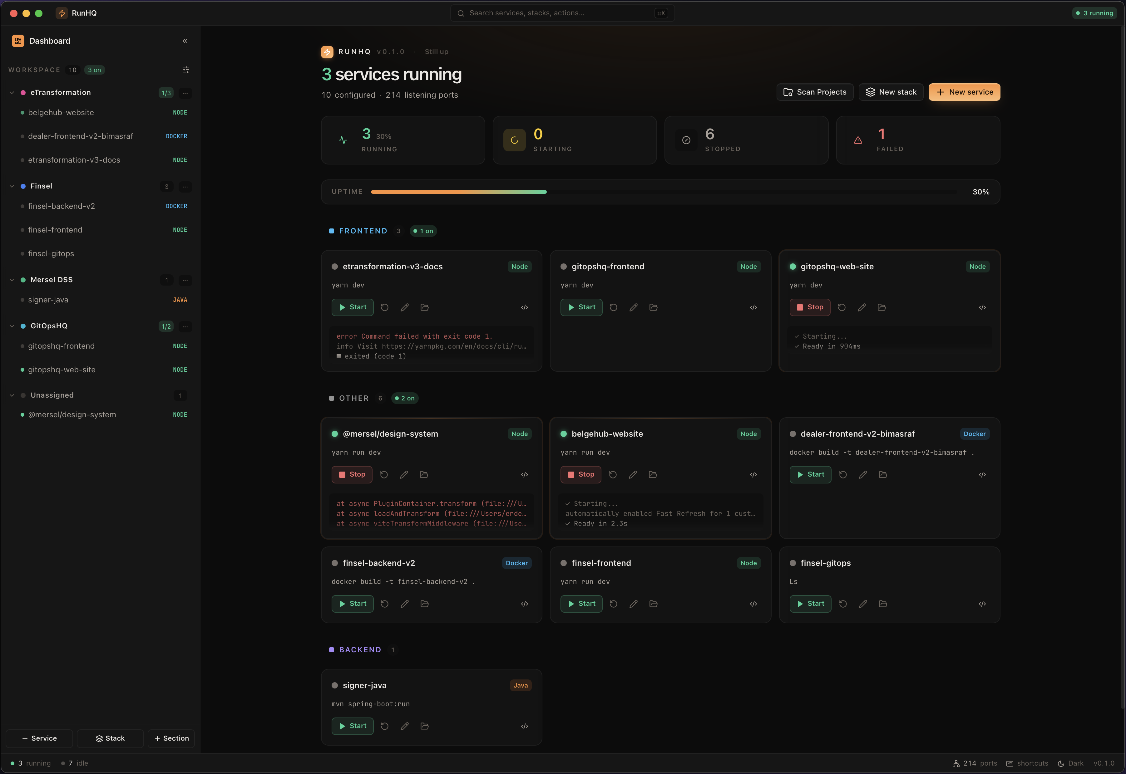 Dozens of projects. Hundreds of services. One native app to start them, open them in your editor, drop into a terminal, and tail their logs — no containers, no cloud, no account.